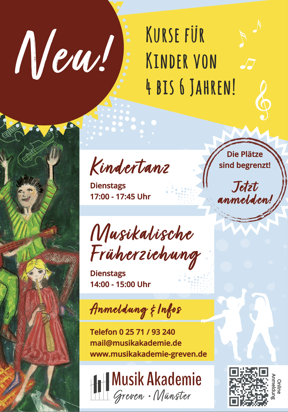 Ab Sommer 2024 bieten wir aufgrund von Zuwachs im Kollegium auch wieder Kurse für Kinder zwischen 4 und 6 Jahren an. Neu im Programm ist „Kindertanz“. Es auch neue Plätze in der „musikalischen Früherziehung“ für Kinder ab 4 Jahren frei.